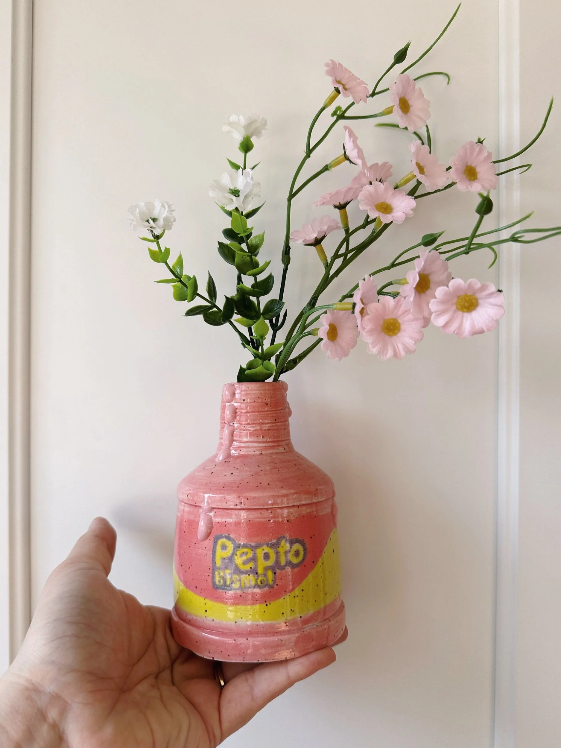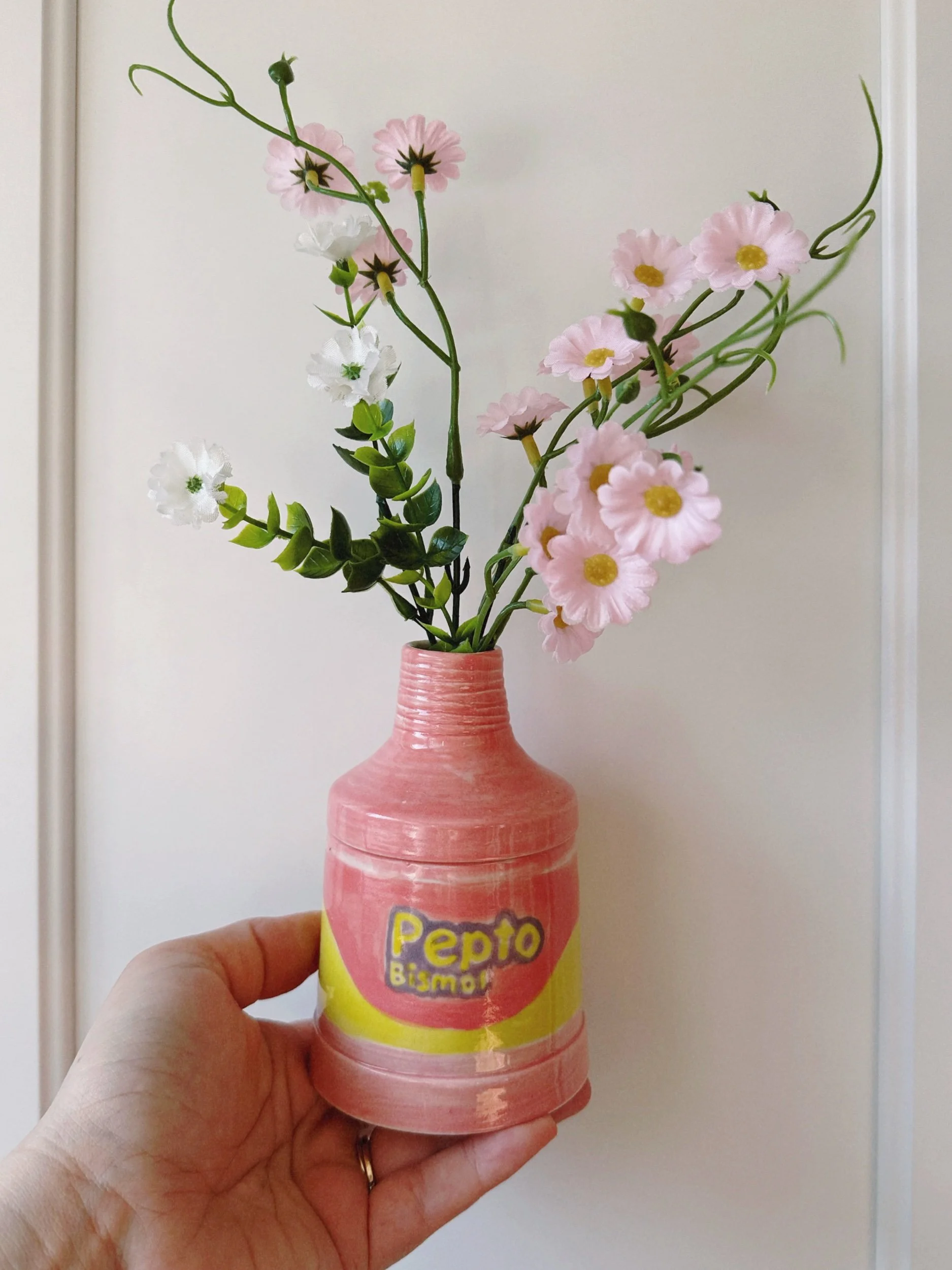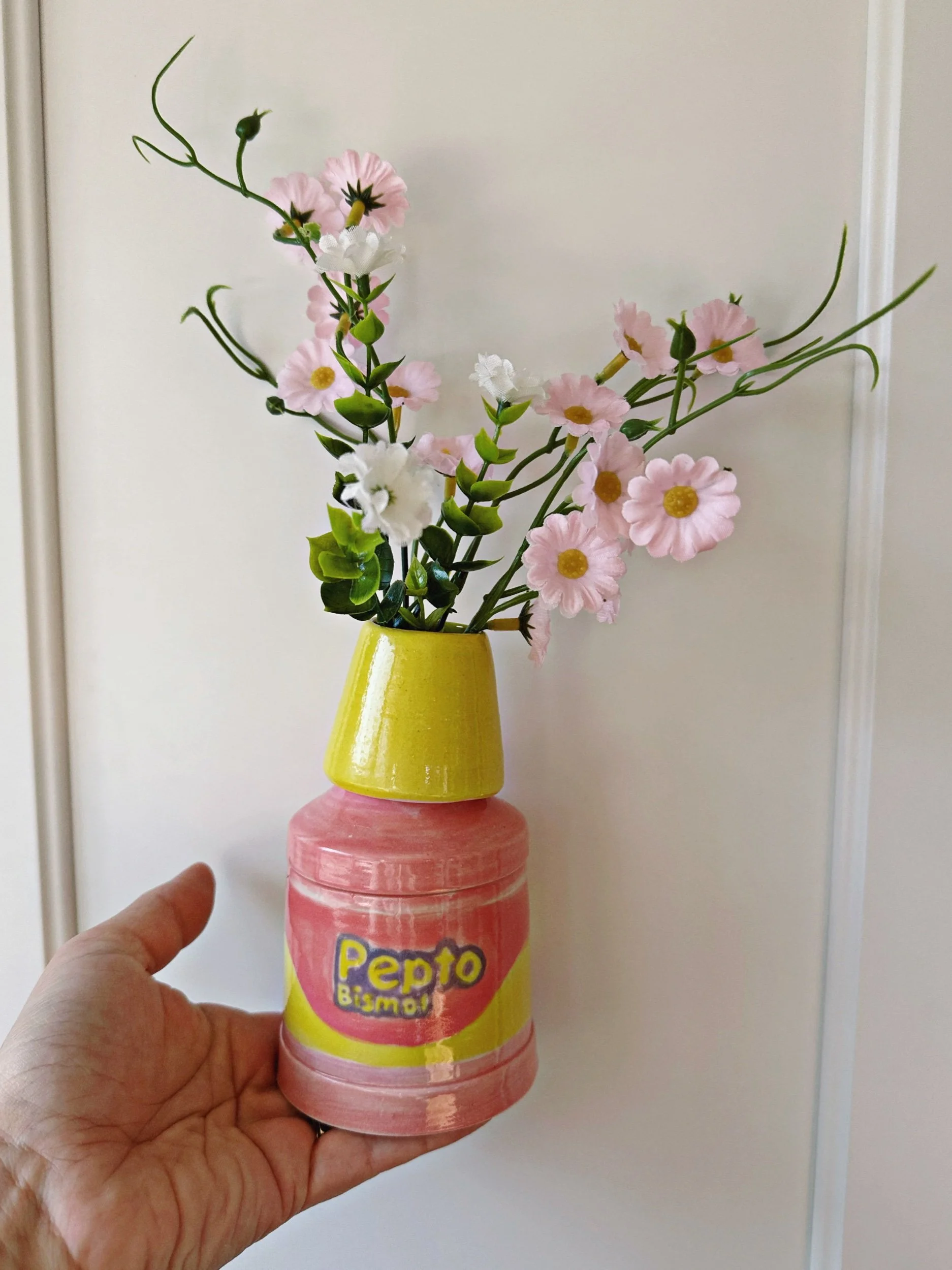 This sculptural vase is perfect for a few short cut flowers or on its own as a decorative accent. Can be styled with or without the yellow lid.